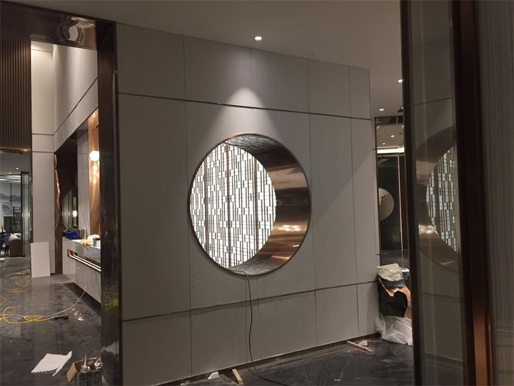 明鉑爾?不銹鋼團隊嚴格安裝施工標準制作不銹鋼屏風隔斷,整圓造型,波浪板吊頂制作安裝。